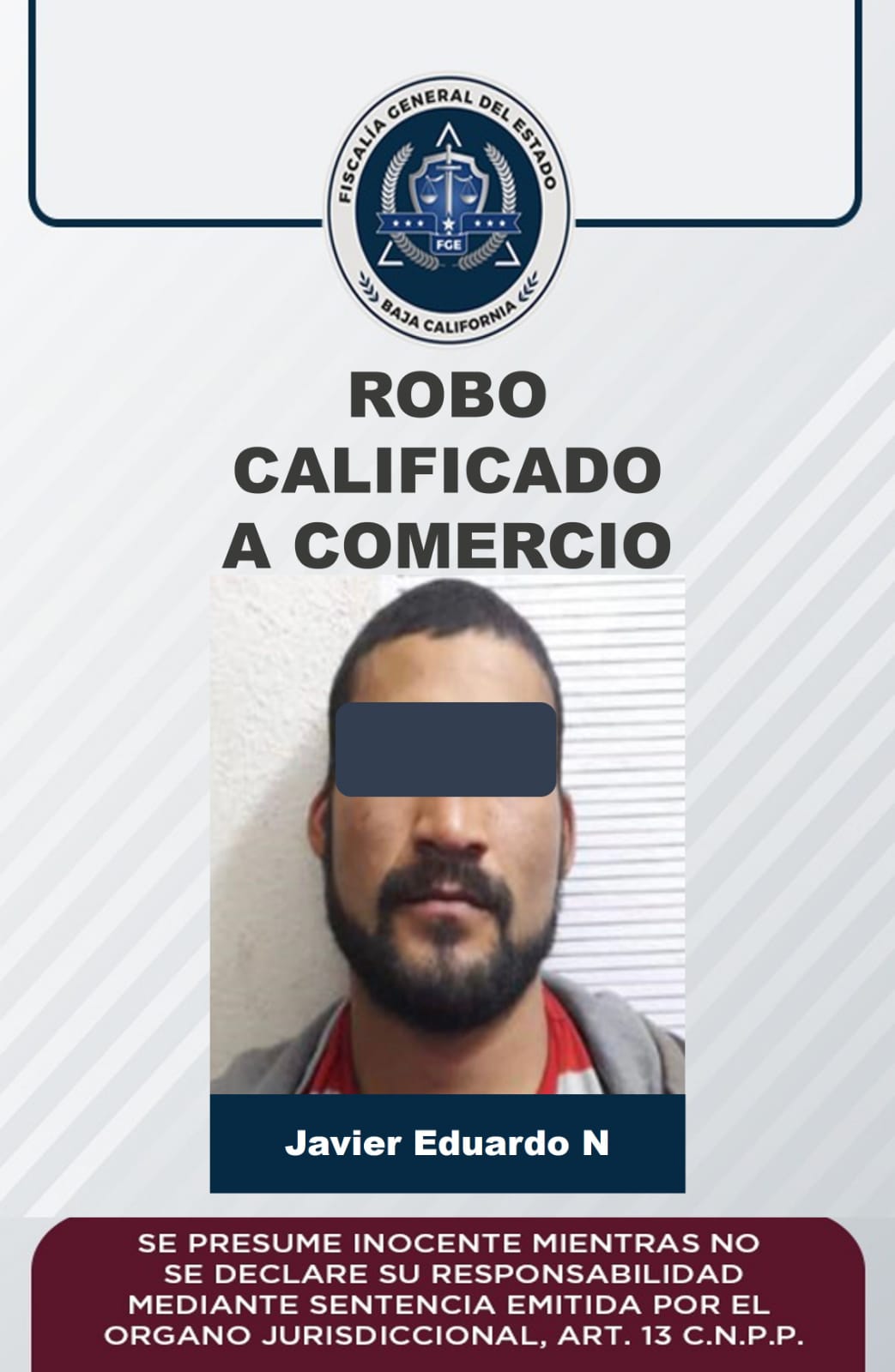San Quintín, B. C. - La Fiscalía Regional de San Quintín, obtuvo auto de vinculación a proceso en contra de Javier Eduardo “N”, por su presunta participación en el delito de robo calificado, cometido en febrero del año en curso.