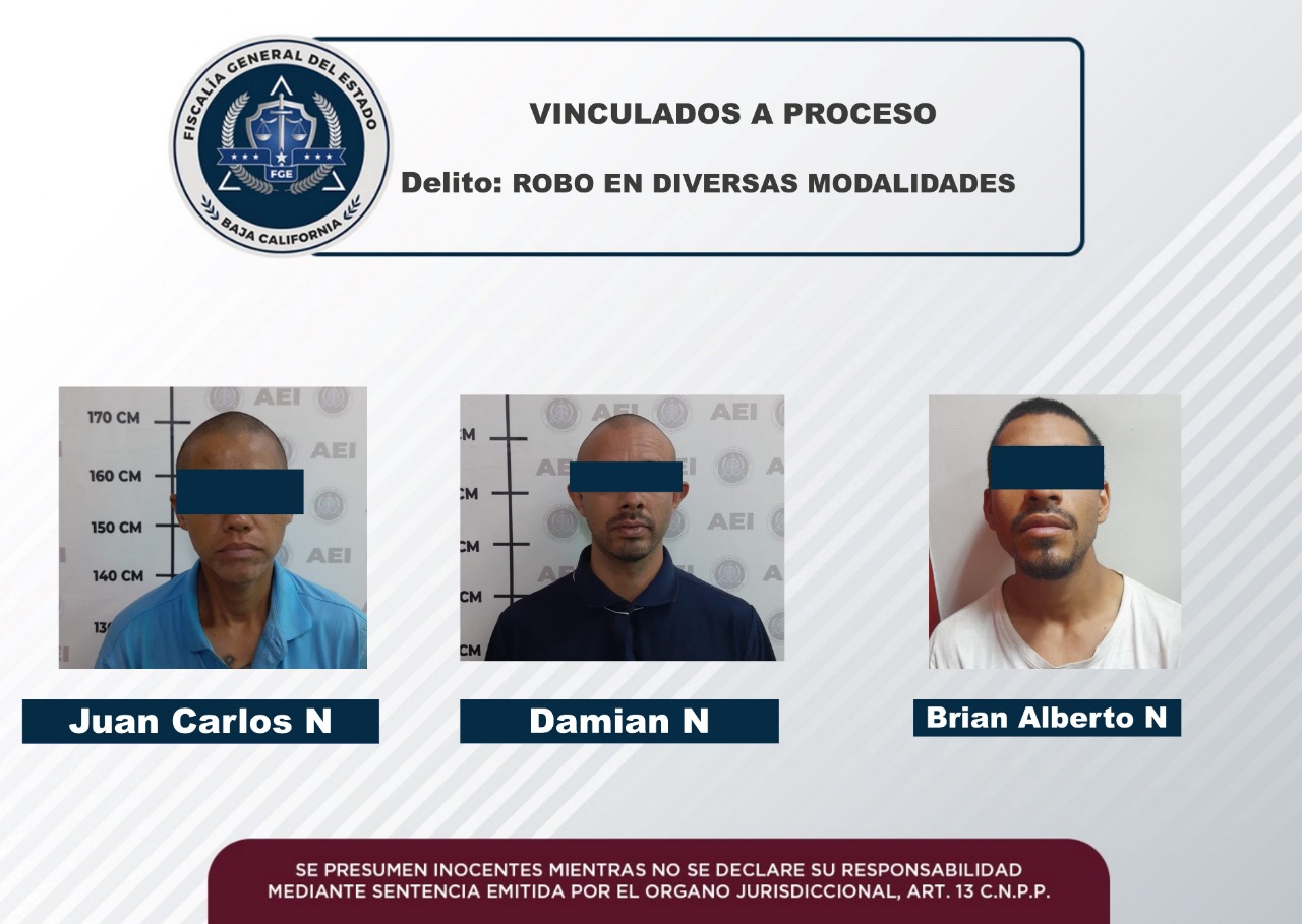 MEXICALI, B. C. - La Fiscalía Regional de Mexicali a través de las Unidades de Investigación de Delitos con Detenidos Oriente y Poniente, como resultado de la integración de las carpetas de investigación, logró la vinculación a proceso de tres hombres en el desarrollo de dos audiencias por separado.