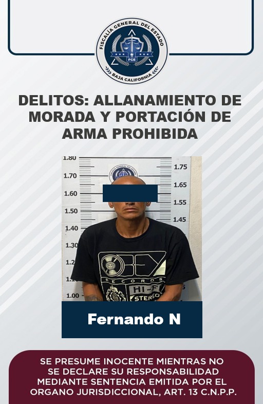 PLAYAS DE ROSARITO, B. C. - La Fiscalía Regional de Playas de Rosarito, a través de la Unidad de Investigación con Detenido, recabó la información necesaria que permitió obtener la vinculación a proceso de Fernando “N”, acusado de los delitos de allanamiento de morada y portación de arma prohibida.