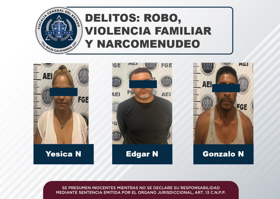 TIJUANA, B. C. - Por los delitos de robo, violencia familiar y narcomenudeo, la Fiscalía General del Estado cumplimentó órdenes de aprehensión a dos hombres y una mujer, quienes fueron arrestados en acciones por separado.