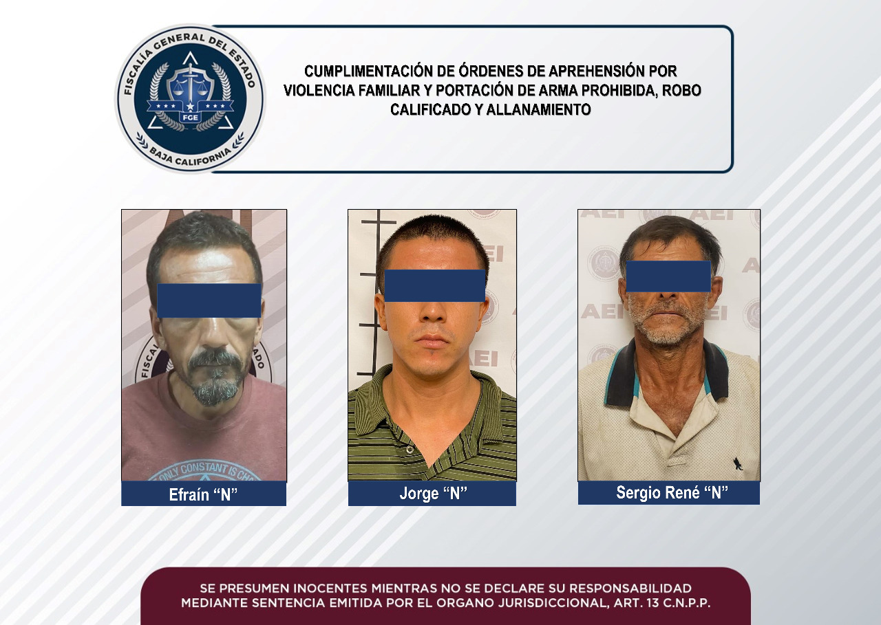 MEXICALI, B. C. - Elementos de la Fiscalía Regional de Mexicali detuvieron a tres sujetos en distintos puntos de la ciudad, que contaban con mandamientos judiciales en su contra.