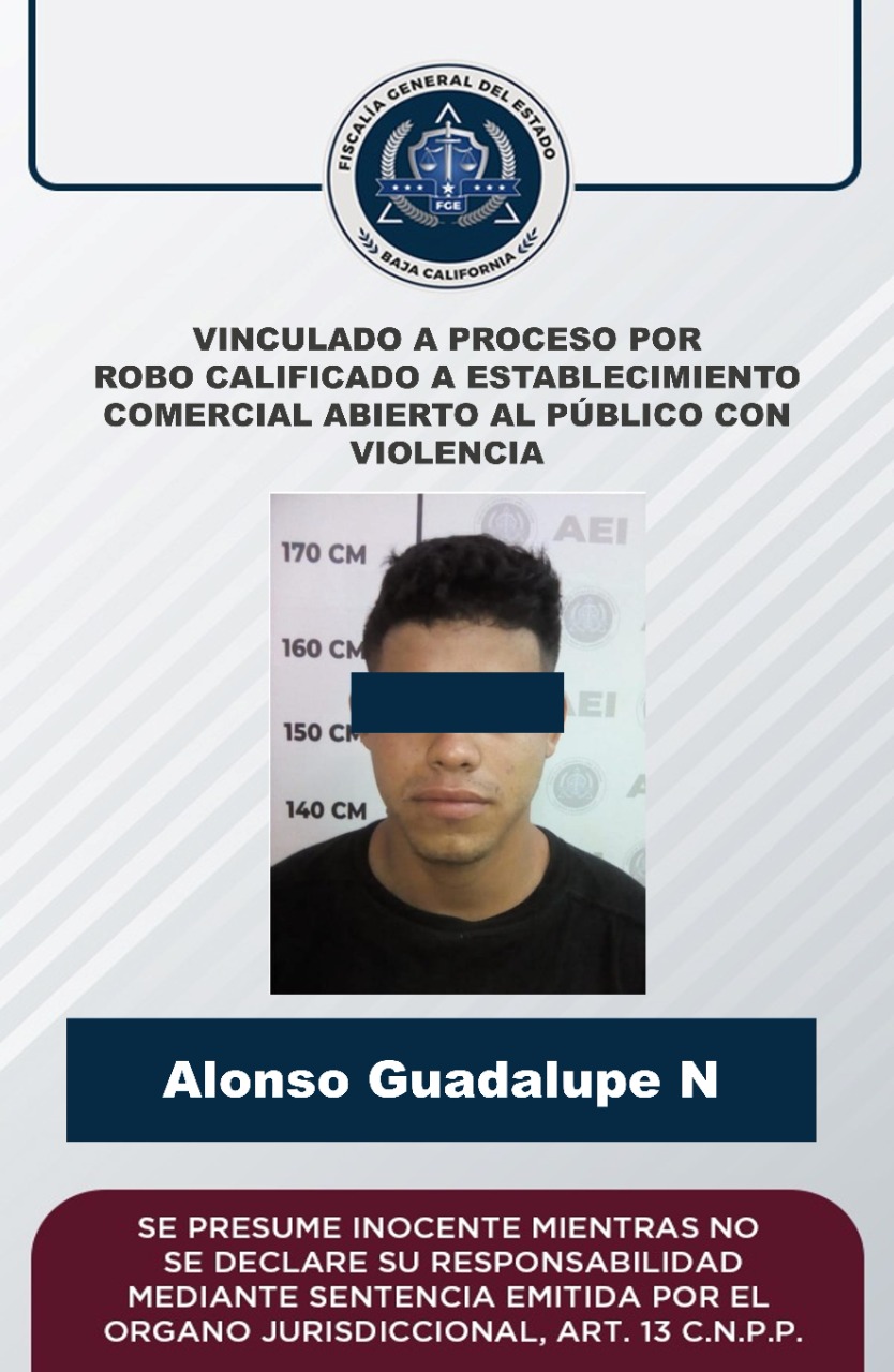 MEXICALI, B. C. - La Fiscalía Regional de Mexicali, a través de la integración de la carpeta de investigación a cargo de la Unidad de Investigación de Robos Poniente, logró la vinculación a proceso de Alonso Guadalupe “N”.