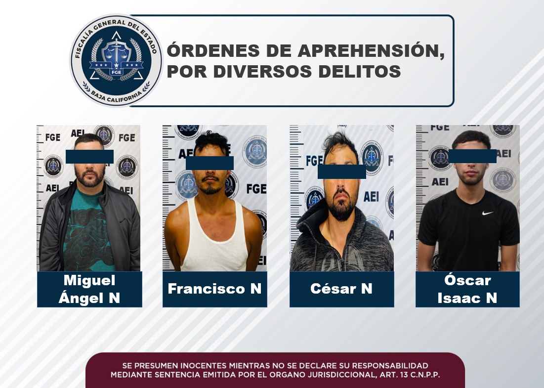 TIJUANA, B. C. - Cuatro sujetos que se mantenían prófugos de la justicia por su probable comisión en diversos delitos, fueron aprehendidos por agentes de la Fiscalía General del Estado.