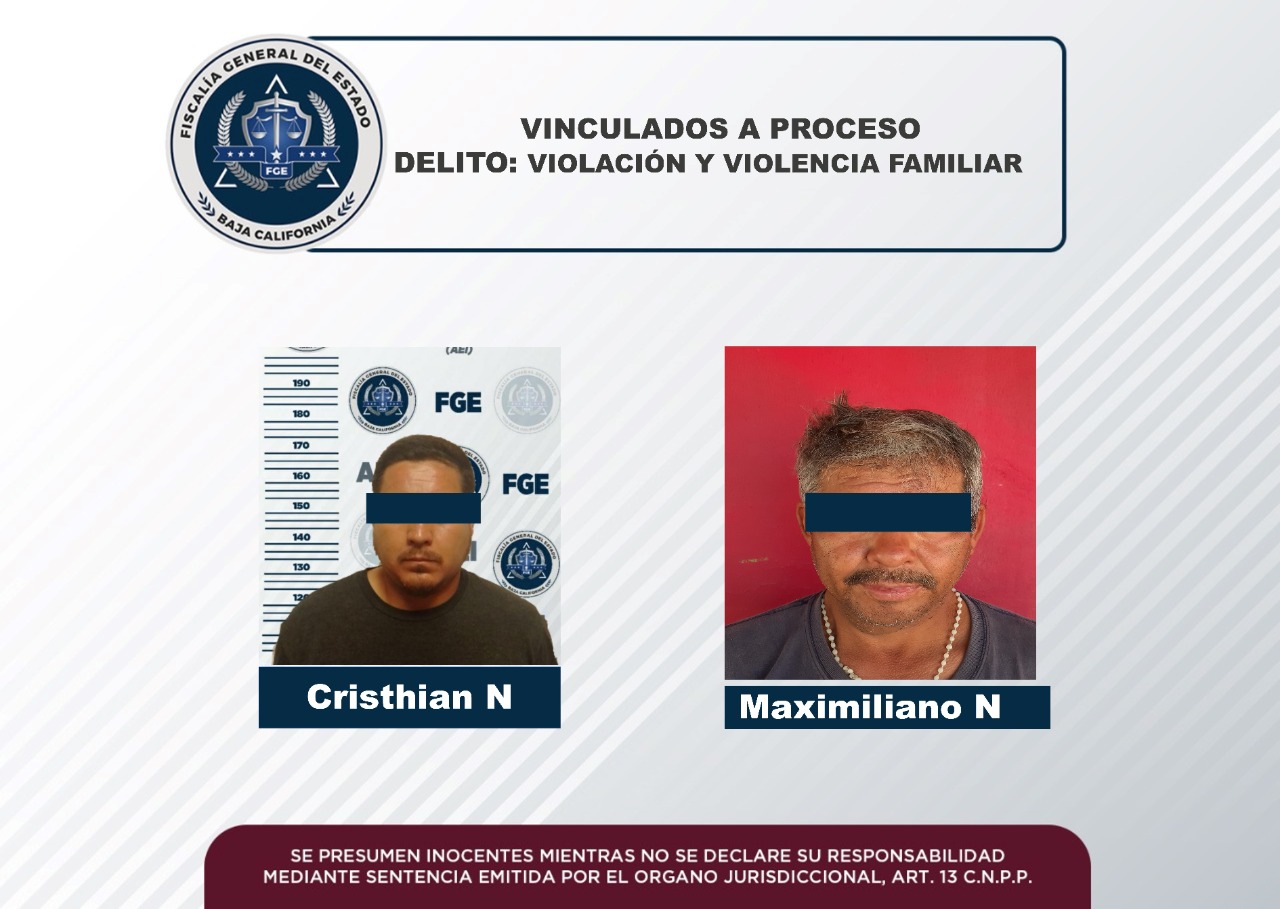 MEXICALI, B. C. - La Fiscalía Regional de Mexicali, a través de la Unidad de Investigación de Ciudad Morelos, logró la vinculación a proceso en contra de dos hombres, en audiencias por separado, por los delitos de violación y violencia familiar.