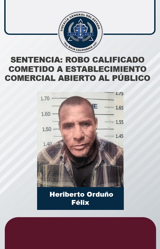 PLAYAS DE ROSARITO, B. C. - Con base a elementos de prueba e información recabada por la Unidad de Investigación Especializada en Delitos de Robos, la Fiscalía Regional de Playas de Rosarito, obtuvo una condena de 3 años y 6 meses de prisión, así como 50 días por concepto de multa, para Heriberto Orduño Félix.