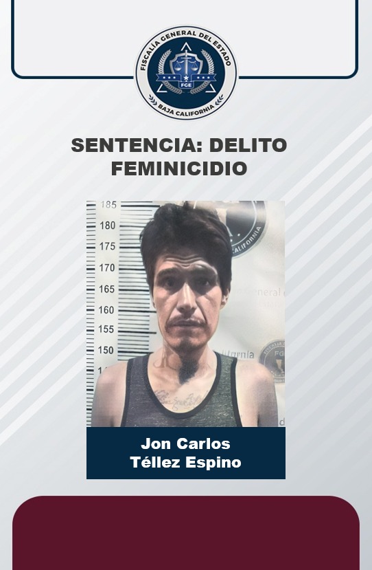TIJUANA, B. C. - Derivado de las pruebas presentadas por el Ministerio Público ante un juez, fue posible para la Fiscalía General del Estado, lograr una sentencia condenatoria de 23 años de prisión para Jon Carlos Téllez Espino, por su culpabilidad en el delito de feminicidio, ocurrido en el año 2021.
