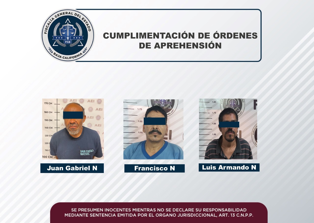 MEXICALI, B. C. - La Fiscalía Regional de Mexicali, a través de la Agencia Estatal de Investigación (AEI), detuvo en hechos por separado, a tres hombres que contaban con orden de aprehensión por diversos delitos.