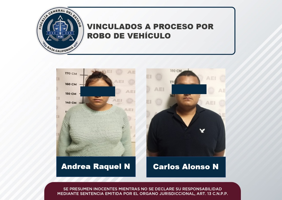 TECATE, B. C. - La Fiscalía Regional de Tecate, a través de las pruebas presentadas por el Ministerio Público ante el Juez de Control, obtuvo la vinculación a proceso de Carlos Alonso “N” y Andrea Raquel “N” por su probable comisión en el delito de robo de vehículo.