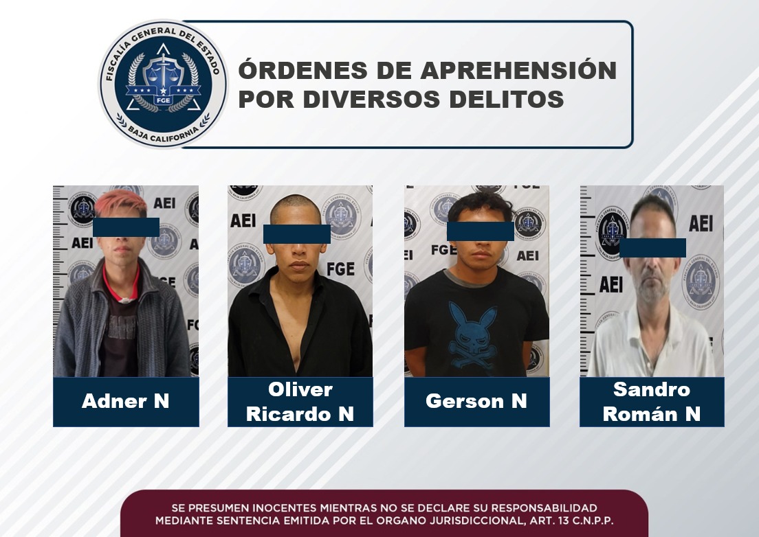 TIJUANA, B. C. - Cuatro hombres que estaban prófugos de la justicia y que presuntamente están relacionados con la comisión de ilícitos, fueron aprehendidos, en acciones distintas, por agentes de la Fiscalía General del Estado.