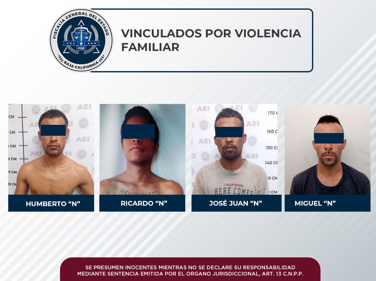 MEXICALI, B. C. - Cuatro hombres acusados de agredir a sus familiares, fueron vinculados a proceso por la Fiscalía Regional de Mexicali, a través de las Unidades de Investigación Foráneas de Guadalupe Victoria, de Ciudad Morelos y la Unidad de Investigación con Detenidos Poniente.