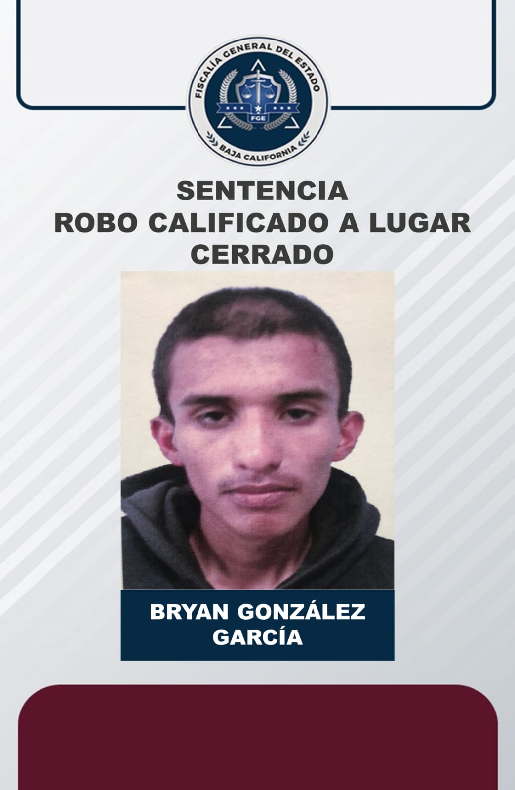 ENSENADA, B. C. - Por el delito de robo calificado a lugar cerrado, la Fiscalía Regional de Ensenada logró sentencia de 6 años 8 meses de prisión y 100 días multa, en contra de Bryan González García.