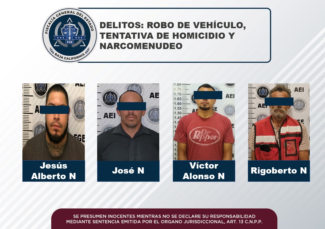 TIJUANA, B. C. - Por contar con mandatos judiciales activos en su contra, cuatro personas fueron aprehendidas por elementos de la Agencia Estatal de Investigación (AEI) de la Fiscalía Regional de Tijuana y puestas a disposición el Juez que solicitó su detención.