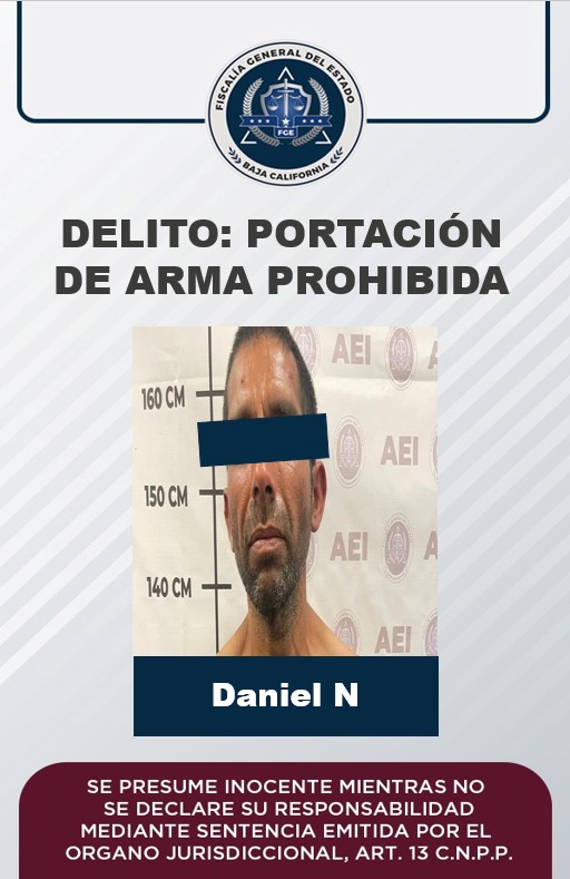 La Fiscalía General del Estado a través de la Agencia Estatal de Investigación, dio cumplimiento a una orden de aprehensión en contra de un sujeto que responde al nombre de Daniel “N”, señalado por su presunta comisión en el delito de portación de arma prohibida, en un hecho ocurrido en Playas de Rosarito.