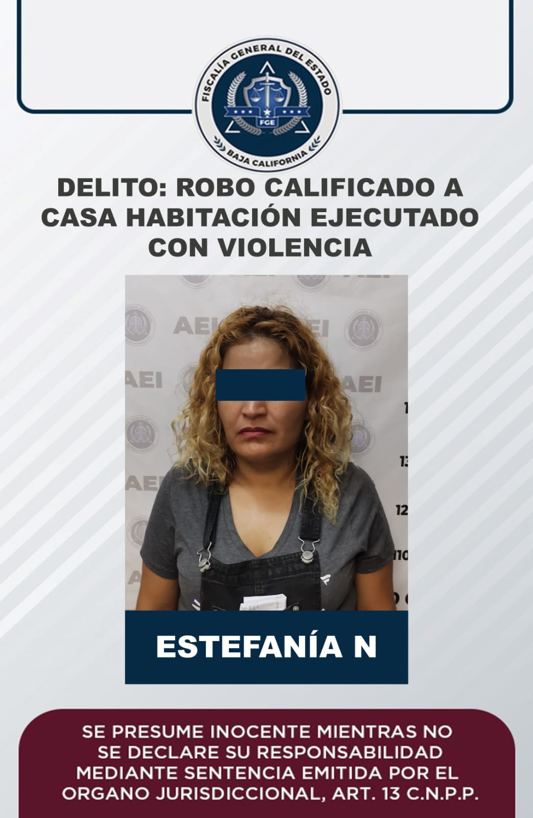 Agentes de la Fiscalía General del Estado capturaron a Estefanía "N", por contar con tres órdenes de aprehensión vigentes por los delitos de robo calificado a casa habitación ejecutado con violencia, robo calificado a establecimiento comercial y robo.