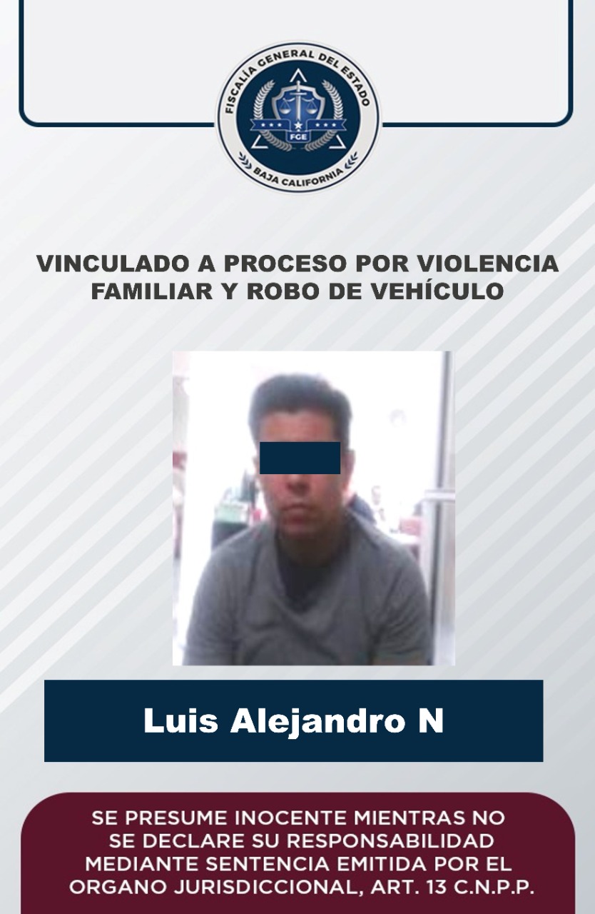 MEXICALI, B. C. - La Fiscalía General de Baja California, a través de la Unidad de Investigación de Robo de Vehículo, logró la vinculación a proceso de Luis Alejandro “N”, por el delito de robo de vehículo y violencia familiar.