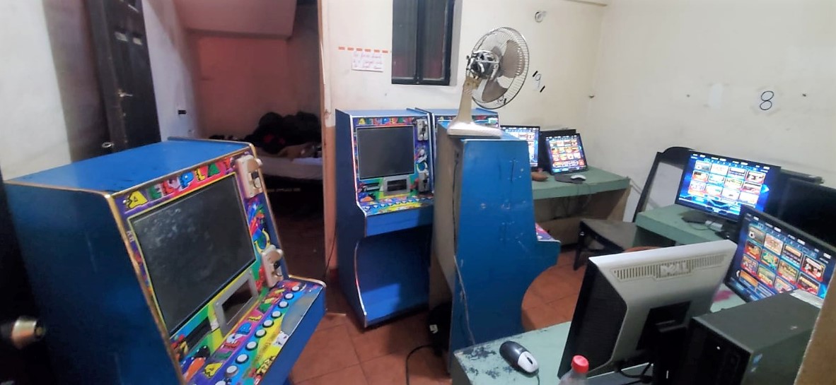 En el cateo realizado en la avenida Constitución de la colonia Independencia, se aseguró a cinco personas: Alejandro “N”, Aarón Cristopher “N”, Elvis Noé “N”, Amisadai “N” y Fátima Estefanía “N”, además, se decomisaron 10 envoltorios de cristal, así como cuatro máquinas tragamonedas y 12 computadoras.