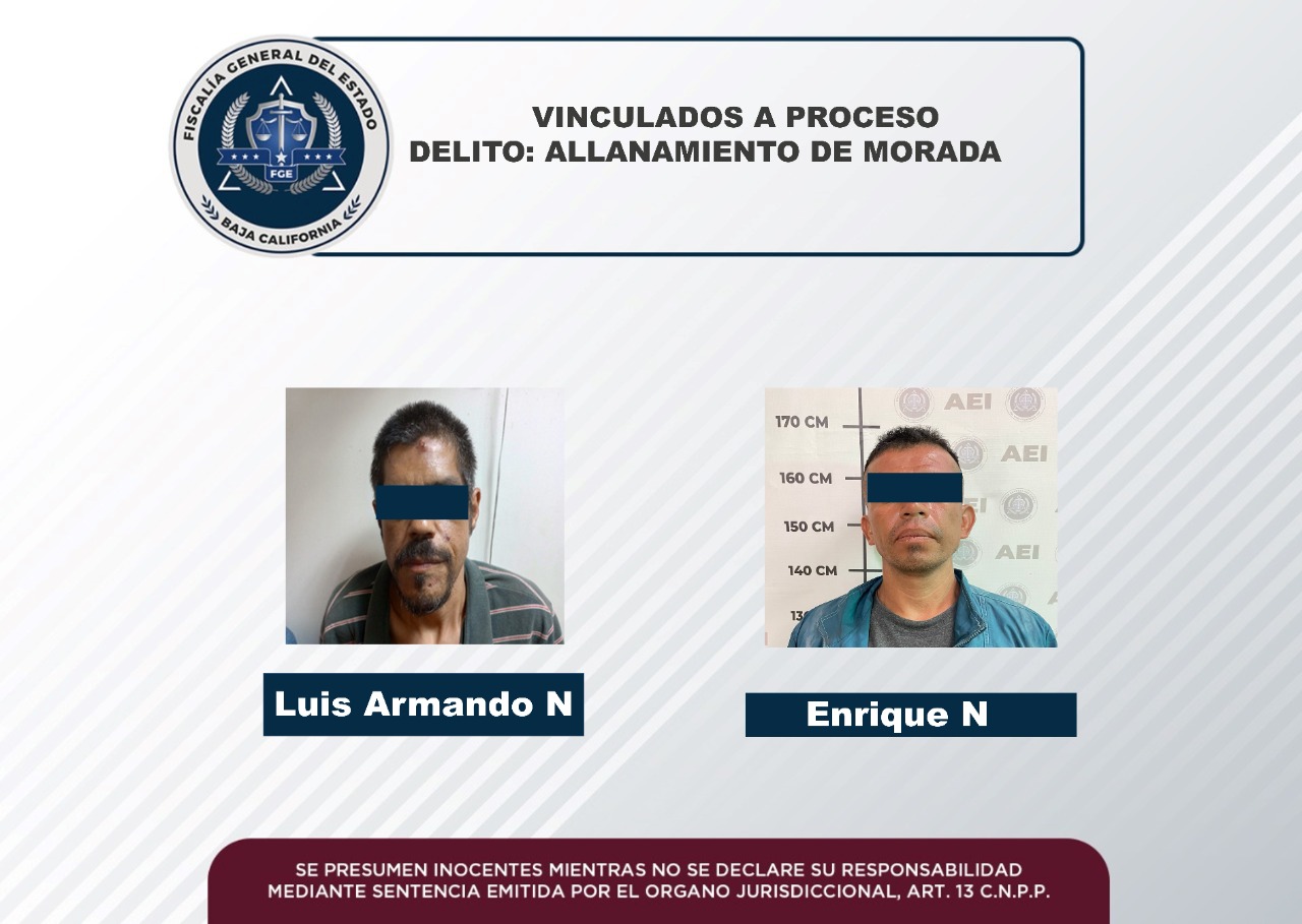 MEXICALI, B. C. - La Fiscalía Regional de Mexicali, a través de la Unidad de Investigación de delitos con Detenidos Poniente, logró la vinculación a proceso en contra de dos sujetos en audiencias por separado, quienes presuntamente cometieron el delito de Allanamiento de Morada.