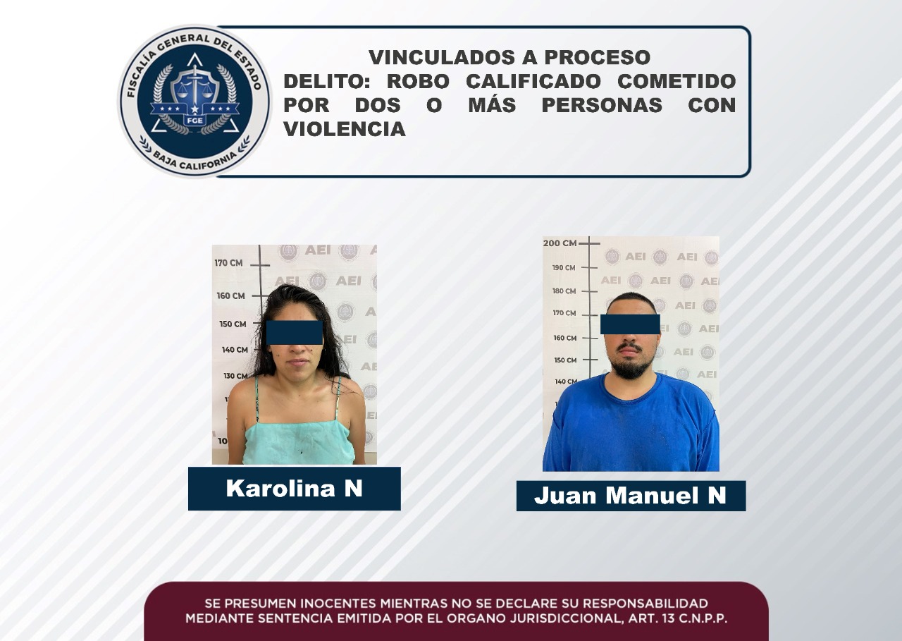 MEXICALI, B. C. - La Fiscalía Regional de Mexicali, logró la vinculación a proceso en contra de Karolina “N” y Juan Manuel “N”, como resultado de la integración de las carpetas de investigación a cargo de la Unidades de Delitos con detenido Oriente.