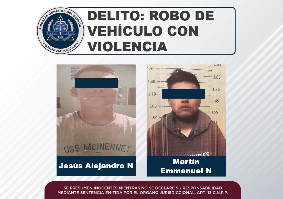PLAYAS DE ROSARITO, B. C. - 25 DE SEPTIEMBRE DE 2022.- Información recabada por la Fiscalía Regional de Playas de Rosarito, a través de la Unidad de Investigación Especializada en Delitos de Robo de Vehículo, permitió obtener la vinculación a proceso de Jesús Alejandro “N”, alias “El Chuy” y Martín Emmanuel “N”, alias “El Smooth”.
