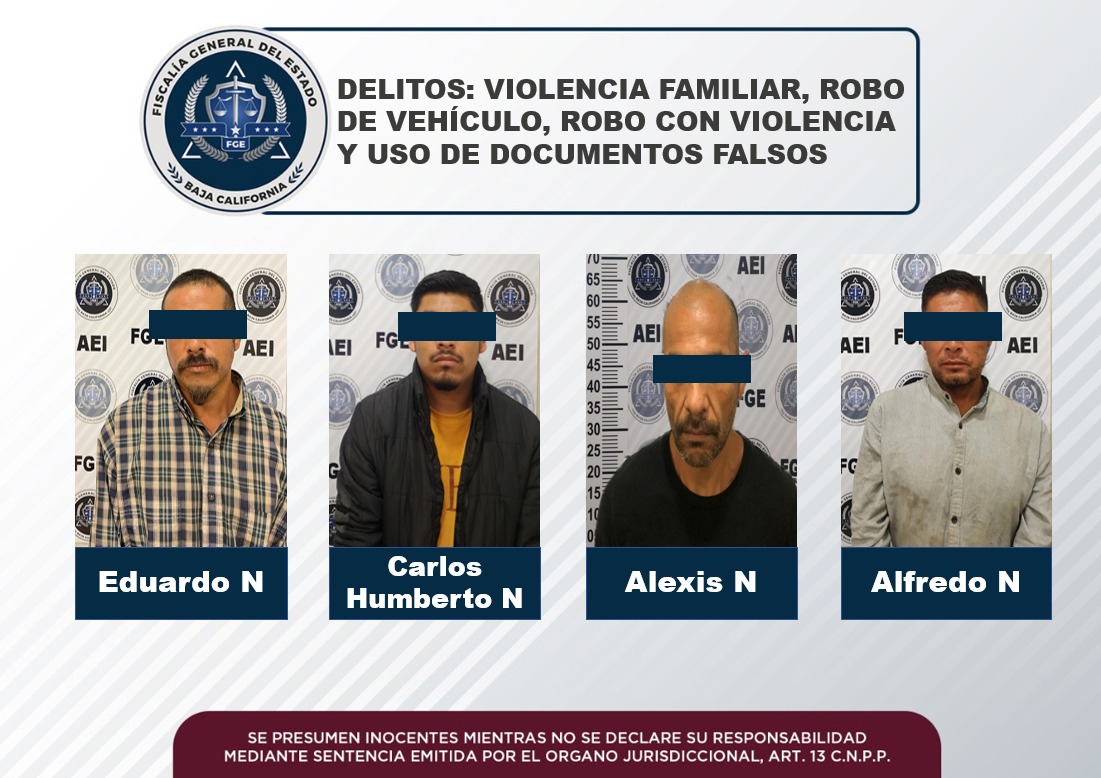 TIJUANA, B. C. - Por su probable comisión en diversos delitos, cuatro hombres fueron aprehendidos en diversas acciones por la Fiscalía General del Estado, a través de la Agencia Estatal de Investigación (AEI).