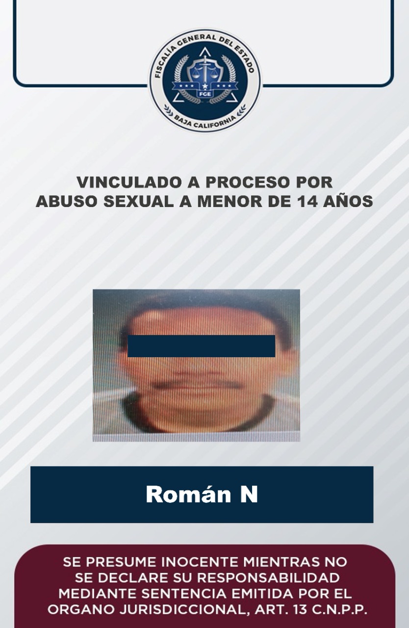 MEXICALI, B. C. - La Fiscalía General del Estado, a través de la Fiscalía Especializada en Delitos Contra la Mujer por Razón de Género, logró la vinculación a proceso en contra de Román “N”, por presuntamente cometer el delito de abuso sexual a menor de 14 años.
