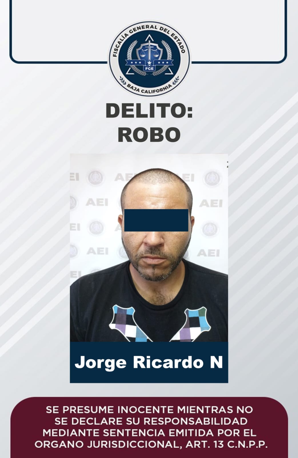 ENSENADA, B. C. - Por el delito de robo, la Fiscalía Regional de Ensenada obtuvo auto de vinculación a proceso y medida cautelar de prisión preventiva en contra de Jorge Ricardo “N”, a quien en días recientes elementos de la Agencia Estatal de Investigación le cumplimentaron una orden de aprehensión.