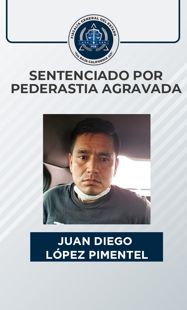 MEXICALI, B. C. - Como parte del compromiso de la Fiscalía General del Estado (FGE), de proteger a la niñez mediante la presentación de carpetas de investigación sólidas, la Fiscalía Especializada en Delitos contra Mujeres por Razón de Género, logró fallo condenatorio de 27 años de prisión en contra de Juan Diego López Pimentel, acusado del delito de pederastia agravada.