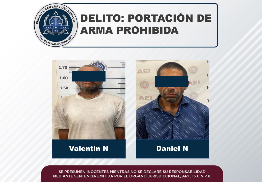 PLAYAS DE ROSARITO, B. C. - Las pruebas recabadas por la Fiscalía Regional de Playas de Rosarito a través de la Unidad de Investigación con Detenido, permitieron obtener la vinculación a proceso de dos sujetos por el delito de portación de arma prohibida.