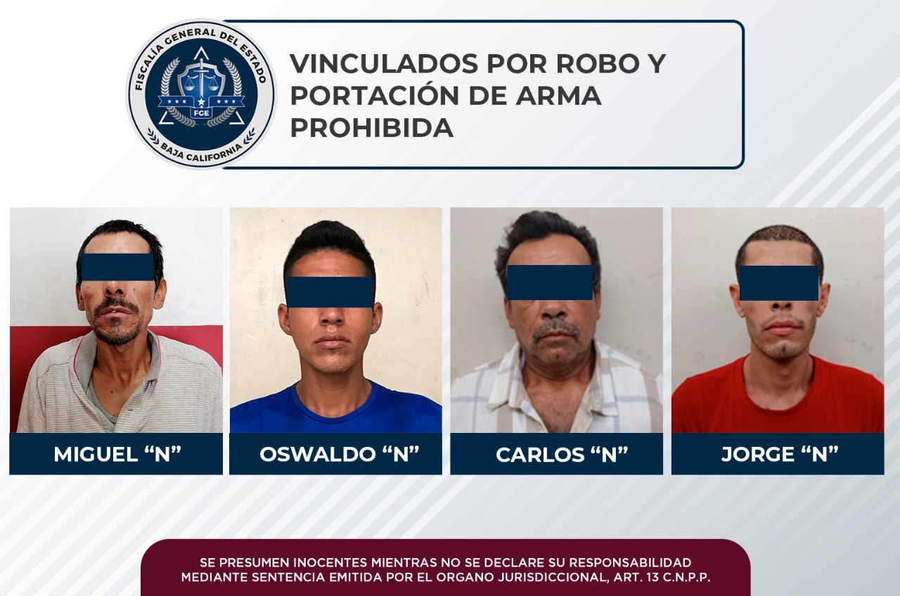La Fiscalía Regional de Mexicali, a través de la Unidad de Investigación con Detenidos Poniente, logró en audiencias por separado la vinculación de cuatro imputados por los delitos de robo y portación de arma prohibida.