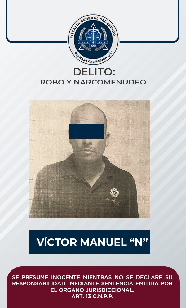 TECATE, B.C. - La Fiscalía Regional de Tecate, mediante las pruebas aportadas por el Ministerio Público, logró que un Juez de Control dictara auto de vinculación a proceso en contra de Víctor Manuel “N”, acusado de los delitos de robo y contra la salud en su modalidad de narcomenudeo.