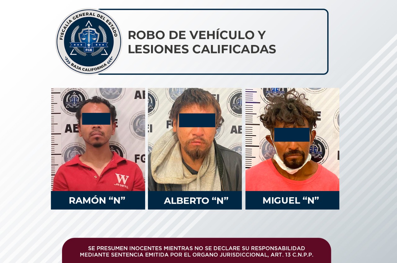 TIJUANA, B.C. - Por su presunta comisión en los delitos de robo de vehículo y lesiones calificadas, tres hombres fueron aprehendidos en diligencias efectuadas por la Fiscalía General del Estado (FGE) a través de la Agencia Estatal de Investigación (AEI).