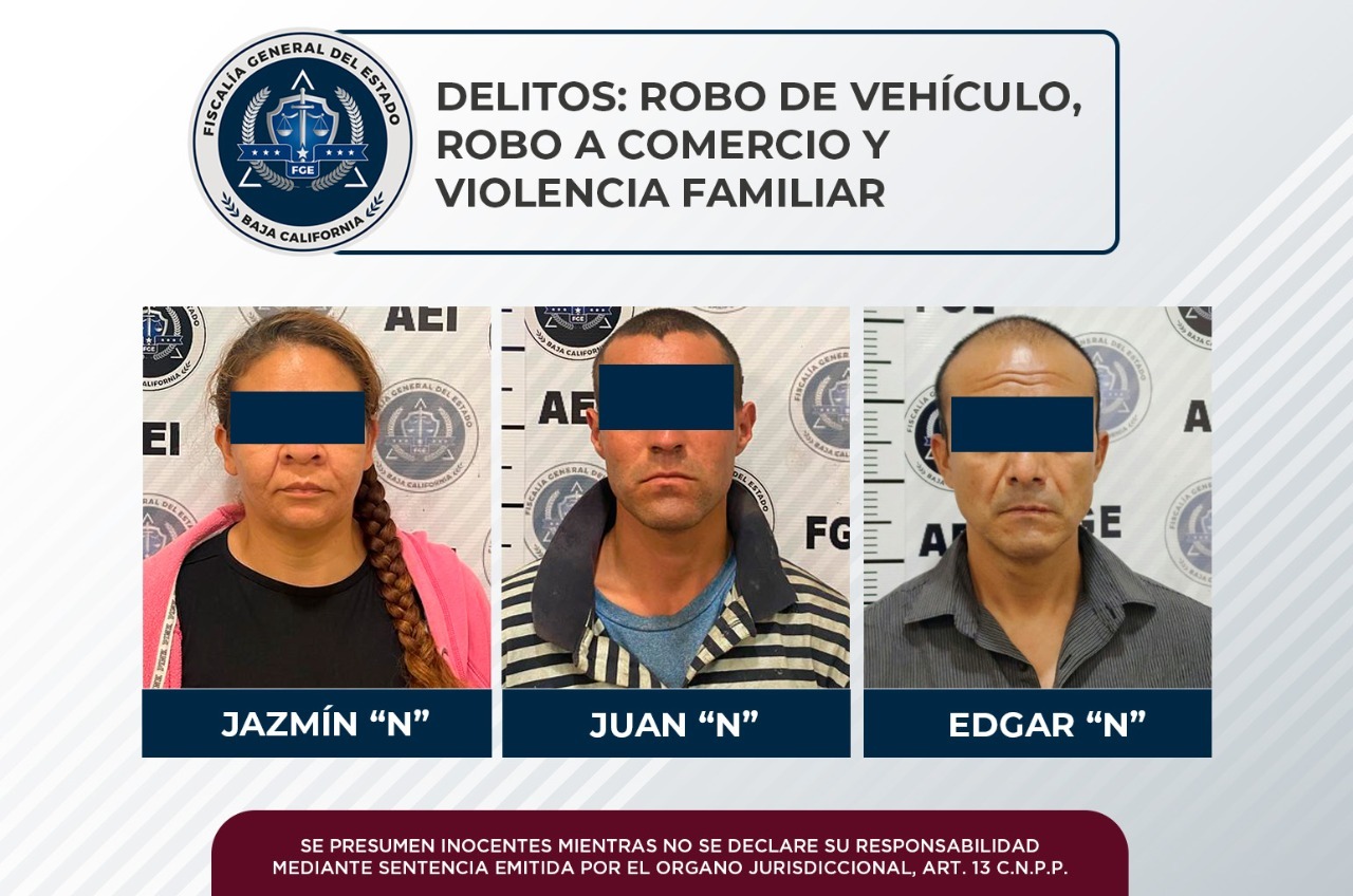 TIJUANA, B.C. - La Fiscalía General del Estado aprehendió a tres personas por diversos delitos, el primer caso es el de Jazmín Guadalupe “N”, sobre quien pesaba un mandamiento judicial por robo calificado a establecimiento comercial abierto al público.