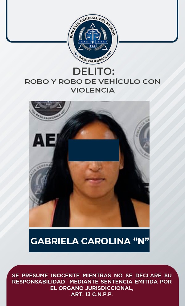 TIJUANA, B. C. - Como resultado de las pruebas recabadas por la Fiscalía Regional de Tijuana, así como de las indagatorias efectuadas, fue posible obtener la vinculación a proceso y medida cautelar de prisión preventiva para Gabriela Carolina “N”, por su presunta participación en los delitos de robo y robo de vehículo con violencia.