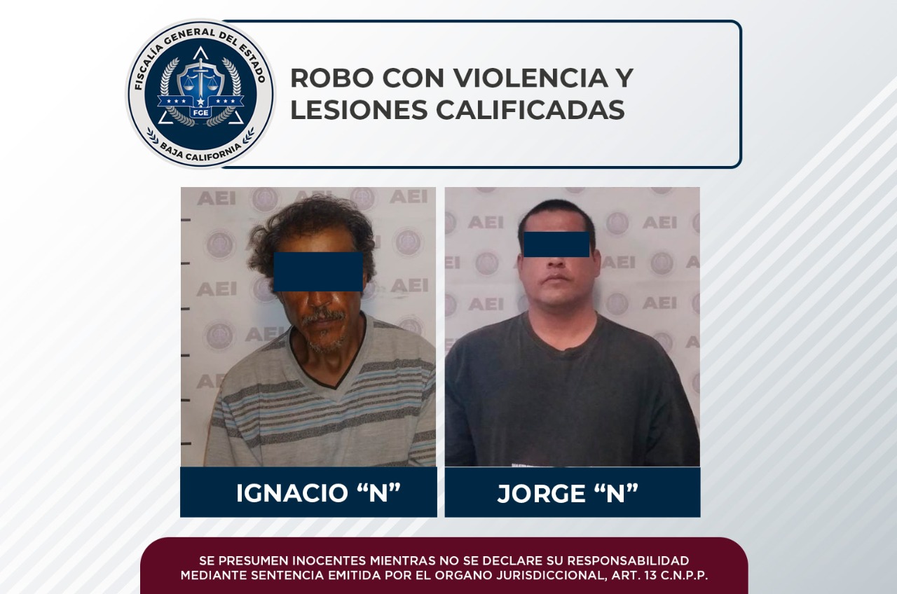 TECATE, B.C. - La Fiscalía Regional de Tecate, a través de la Agencia Estatal de Investigación (AEI), llevó a cabo diversas diligencias que permitieron cumplimentar dos mandatos judiciales, al mismo número de personas, por los delitos de robo con violencia y lesiones calificadas.