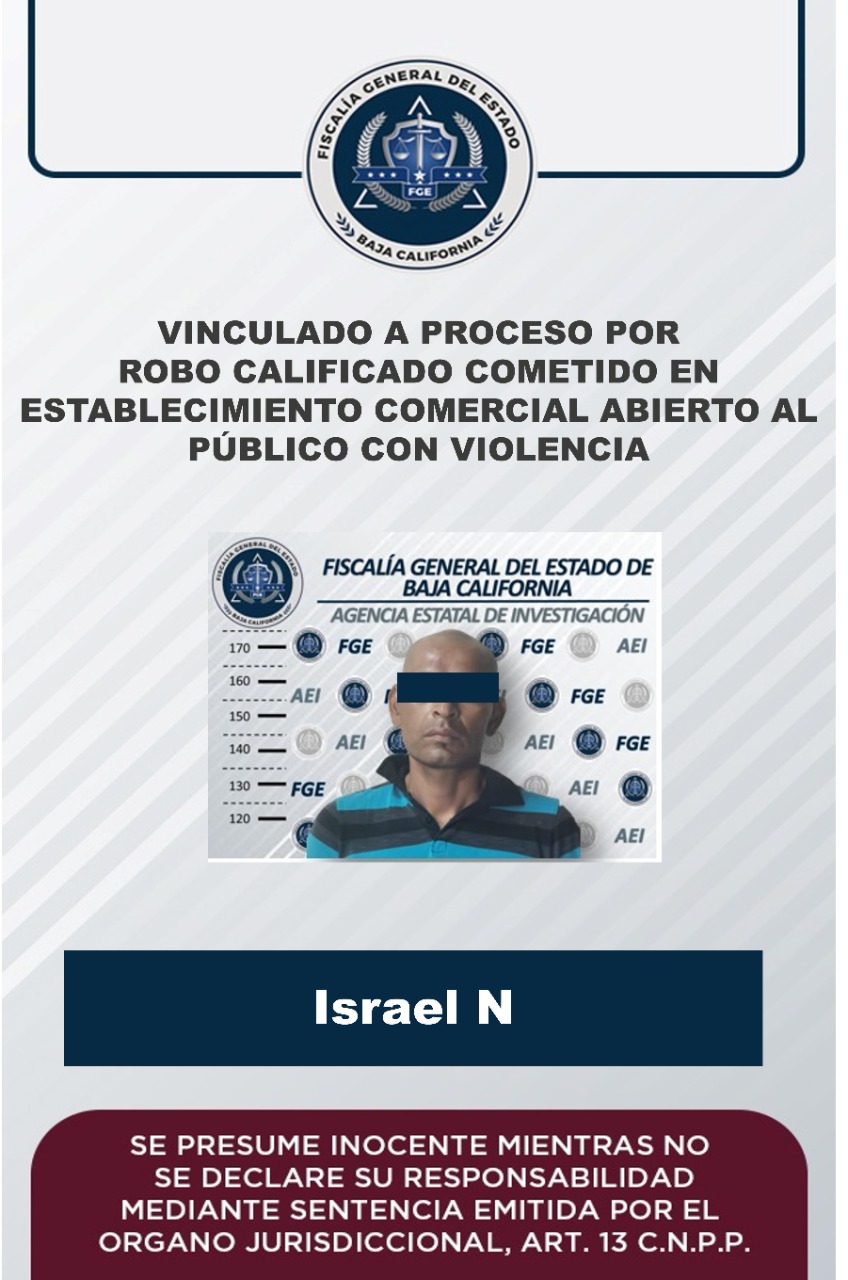 MEXICALI, B.C. - La Fiscalía Regional de Mexicali, a través del trabajo realizado en la integración de la carpeta de investigación de la Unidad de Robos Poniente, logró la vinculación a proceso penal en contra de Israel “N”, por el delito de robo calificado cometido en establecimiento comercial abierto al público con violencia.