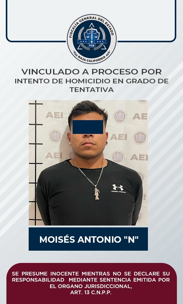 Tijuana, B. C. - Como resultado de una respuesta inmediata tras atender un reporte por personas lesionadas con arma de fuego en las inmediaciones del callejón Coahuila en la Zona Norte de la ciudad de Tijuana, elementos de la Agencia Estatal de Investigación, lograron asegurar al presunto responsable de nombre Moisés Antonio “N”, quien quedó vinculado a proceso el día de hoy por el delito de homicidio calificado en grado de tentativa.