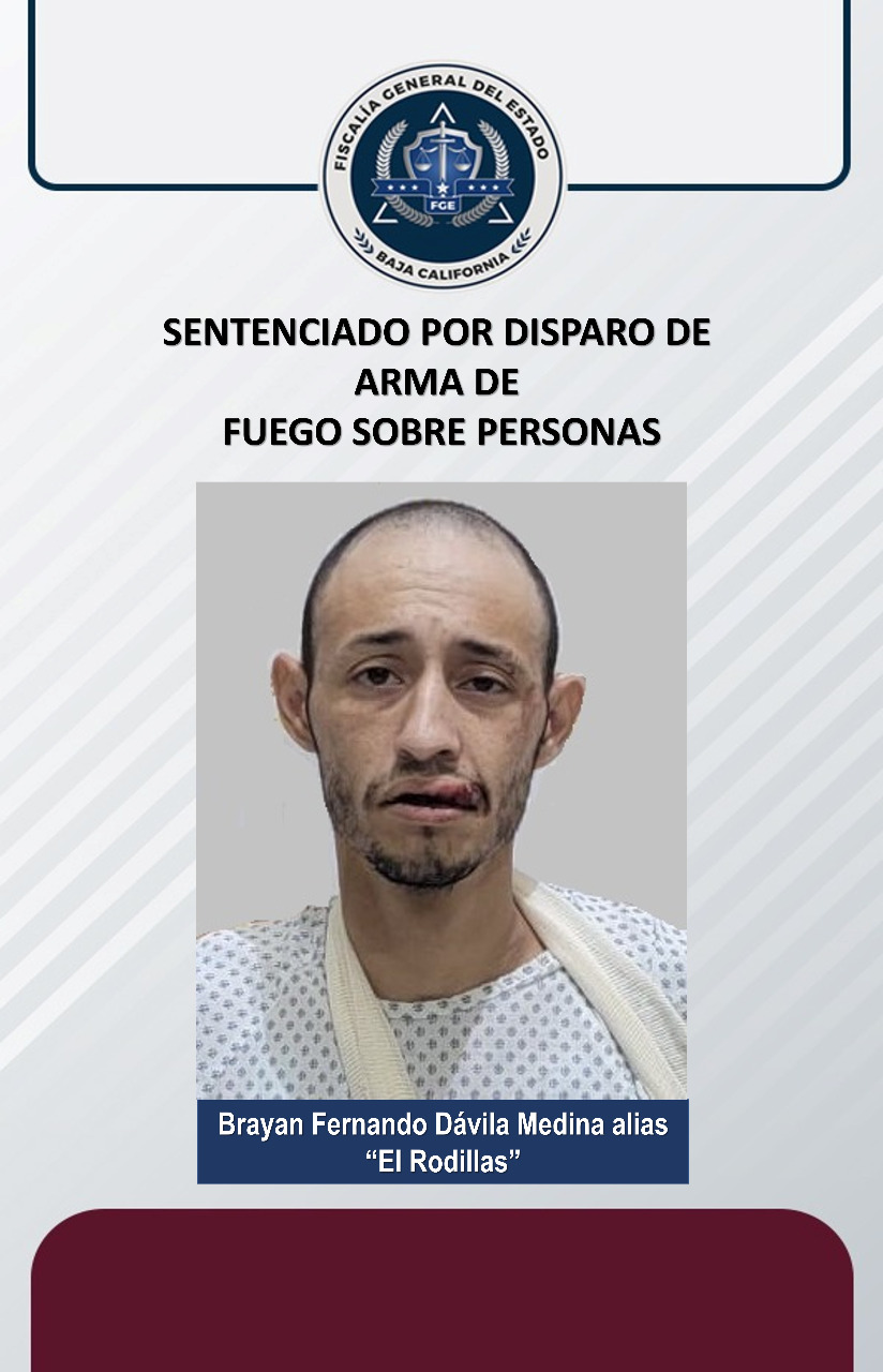 MEXICALI, B.C. - La Fiscalía General del Estado (FGE), a través de la Fiscalía Especializada en Delitos Contra la Vida, obtuvo una sentencia condenatoria en contra de Brayan Fernando Dávila Medina alias “El Rodillas”, por el delito de disparo de arma de fuego sobre personas.