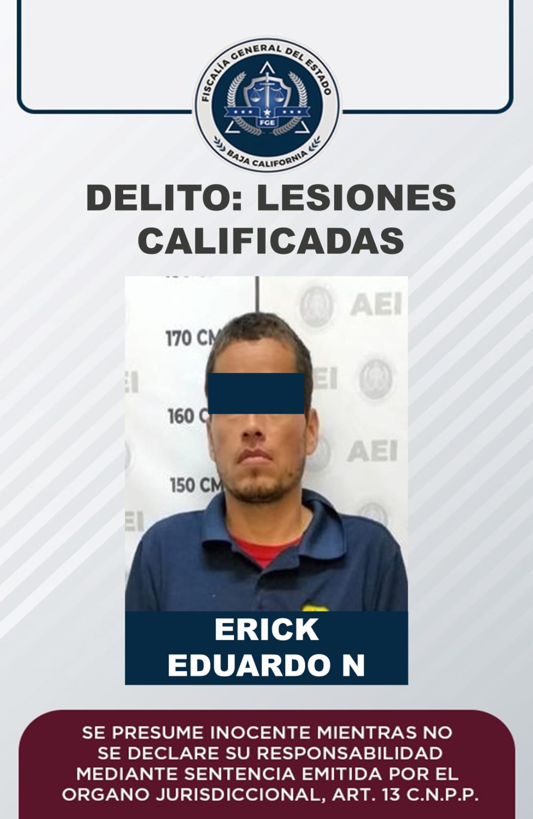 ENSENADA, B.C. - 10 DE OCTUBRE DE 2022.- La Fiscalía Regional de Ensenada obtuvo auto de vinculación a proceso por el delito de lesiones calificadas en contra de Erick Eduardo “N” de 39 años, detenido el 5 de octubre del año en curso tras ocasionar heridas a un hombre con un arma blanca.