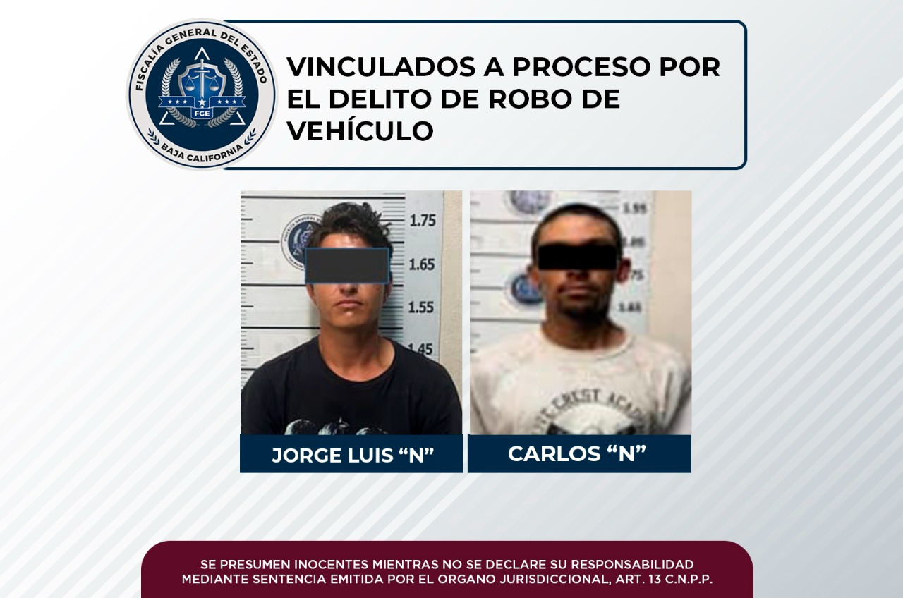 PLAYAS DE ROSARITO, B. C. -Dos hombres fueron vinculados a proceso por su presunta responsabilidad en el delito de robo de vehículo, tras investigaciones realizadas por la Fiscalía Regional de Playas de Rosarito.