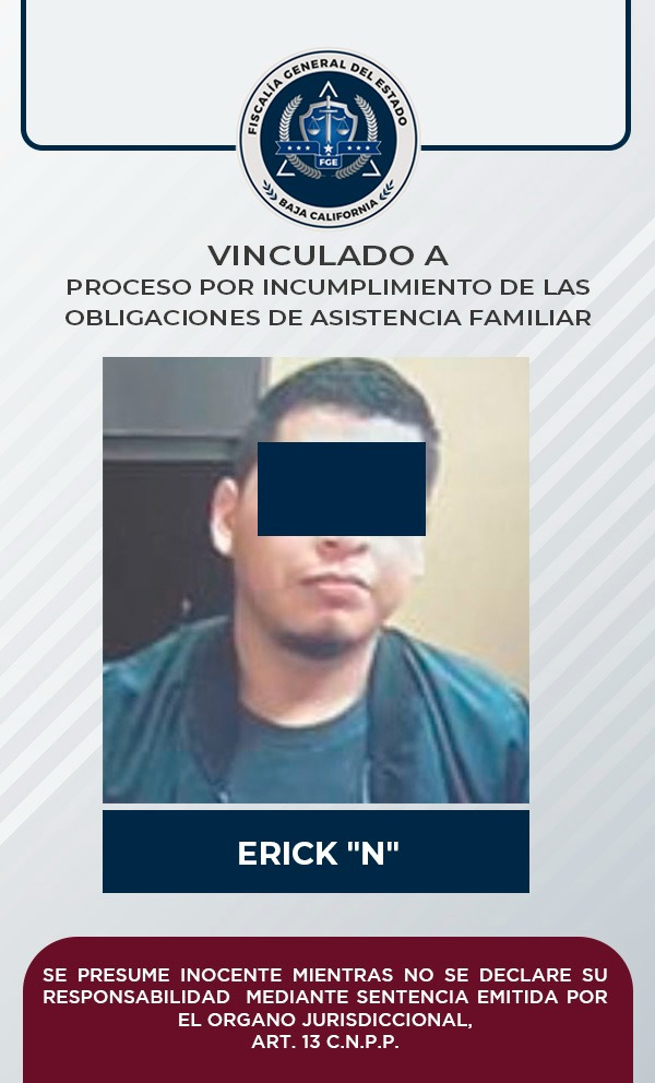 PLAYAS DE ROSARITO, B. C. - 9 DE OCTUBRE DE 2022.- Como resultado de acciones de investigación efectuadas por la Fiscalía Regional de Playas de Rosarito, fue posible obtener por parte de un Juez de Control, el auto de vinculación a proceso de Erick “N”, por el delito de incumplimiento de las obligaciones de asistencia familiar.