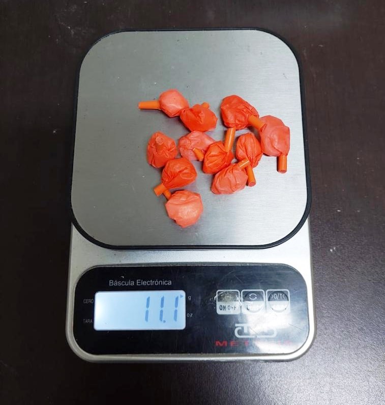 Durante la diligencia al predio se decomisaron una bolsa de plástico transparente con cierre hermético, al interior había 11 envoltorios de plástico color naranja, conteniendo todos y cada uno de ellos una sustancia granulada al tacto con las características de la droga conocida como cristal.
