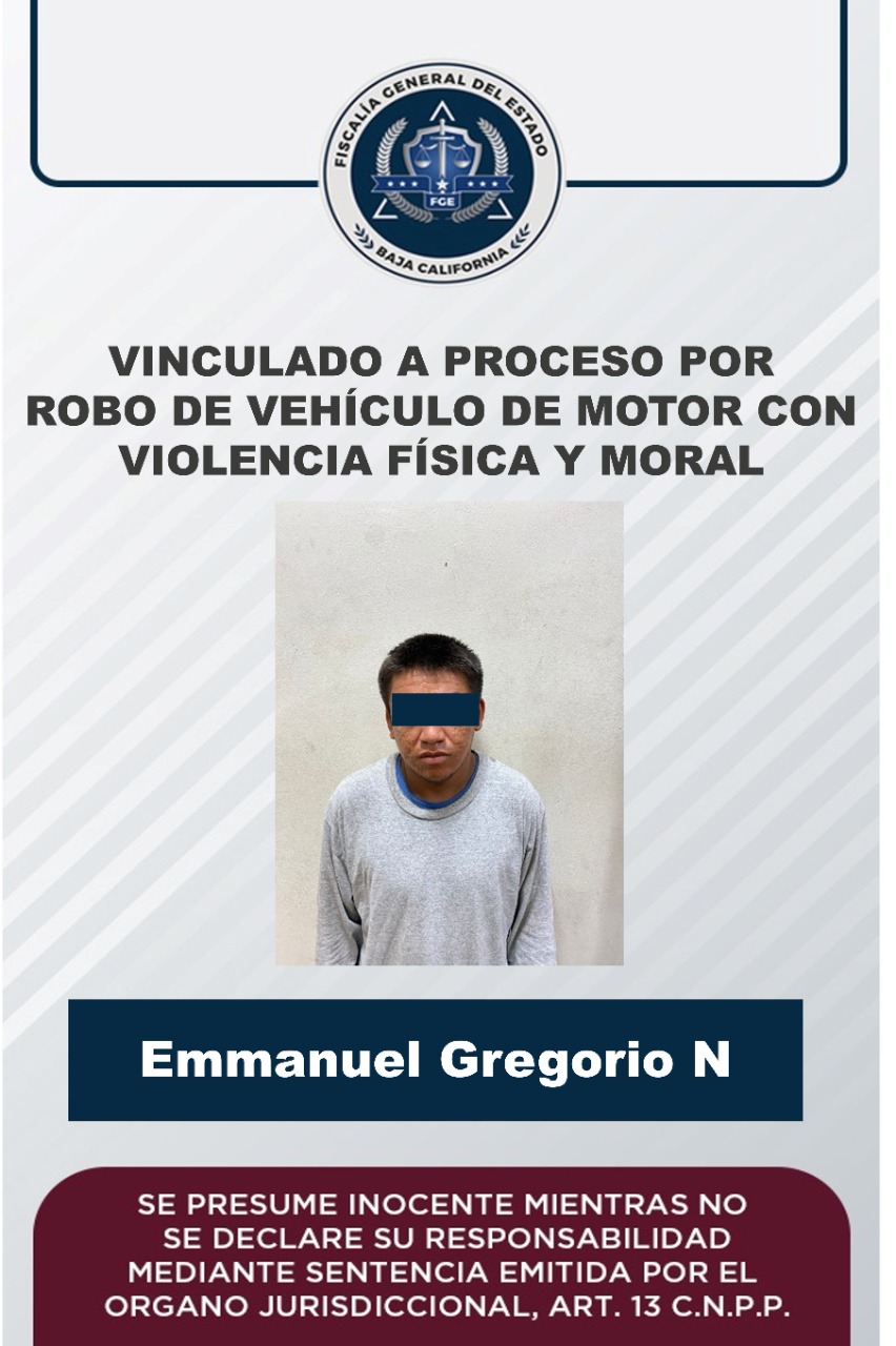 MEXICALI, B. C. - La Fiscalía Regional de Mexicali, a través de la Unidad de Robo de Vehículos, logró la vinculación a proceso de Emmanuel Gregorio “N”, por presuntamente sin consentimiento y con violencia, robar un vehículo de motor.