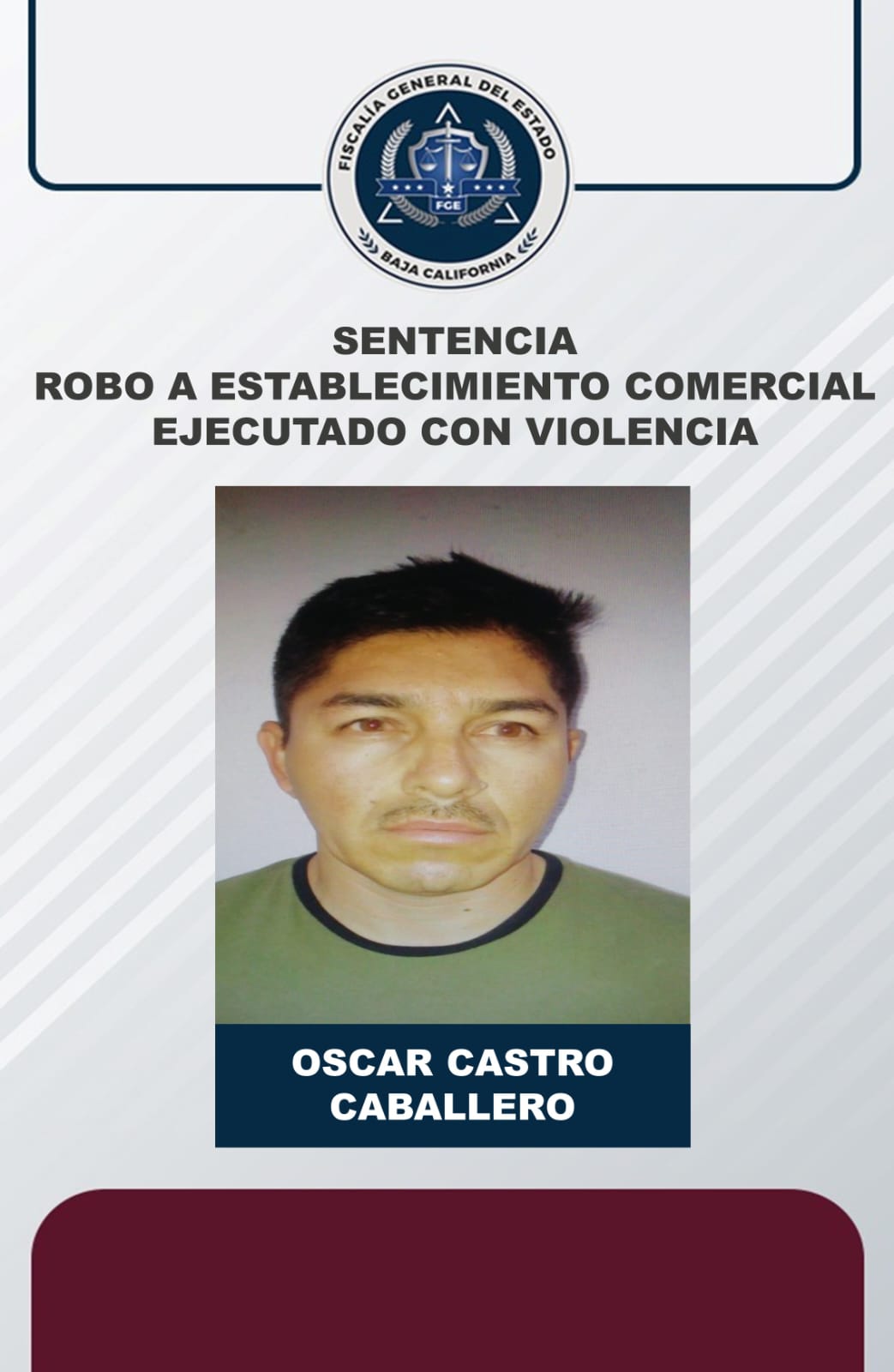 ENSENADA, B. C. - La Fiscalía Regional de Ensenada logró sentencia condenatoria en contra de Oscar Castro Caballero por su participación en el robo con violencia sucedido en una negociación, donde los asaltantes a punta de pistola sustrajeron 150 mil pesos y 11 mil 900 dólares en efectivo.
