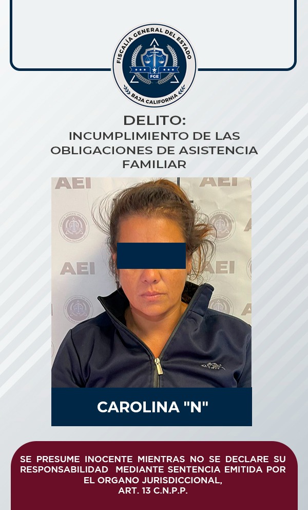 PLAYAS DE ROSARITO, B. C. - Por el delito de incumplimiento de las obligaciones de asistencia familiar, la Fiscalía General del Estado, cumplimentó una orden de aprehensión en contra de una mujer que responde al nombre de Carolina del Carmen “N”.