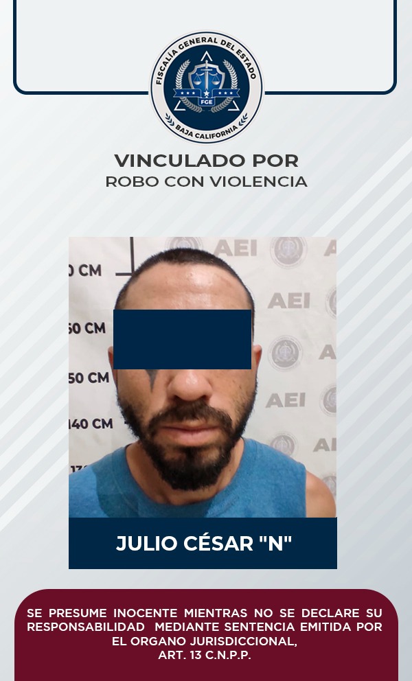 MEXICALI, B.C. - Después de analizar los elementos de prueba presentados por la Fiscalía Regional de Mexicali, el Juez de Control, vinculó a proceso con la medida cautelar de prisión preventiva a Julio César “N”, acusado por el delito de robo calificado a establecimiento comercial abierto al público.