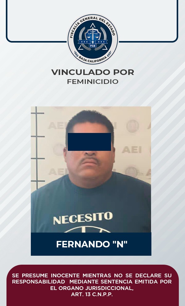 TECATE, B.C. - La Fiscalía General del Estado, a través de la Fiscalía Especializada en Delitos Contra la Vida, logró que fuera vinculado a proceso Fernando “N” por su probable participación en el delito de feminicidio en perjuicio de una mujer que en vida respondiera al nombre de Beatriz; el Juez de Control le impuso medida cautelar de prisión preventiva.