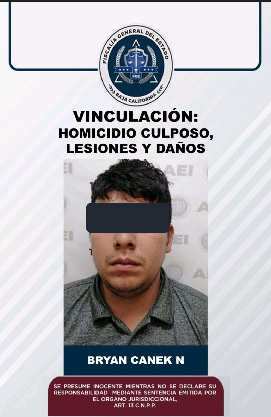 ENSENADA, B.C. - La Fiscalía Regional de Ensenada obtuvo vinculación a proceso contra Bryan Canek “N”, conductor de un tráiler que, el sábado 8 de octubre del año en curso, provocó un accidente automovilístico ocasionando dos pérdidas humanas, serias lesiones a 13 personas y daños a 8 vehículos embestidos sobre la carretera Ensenada-San Miguel.