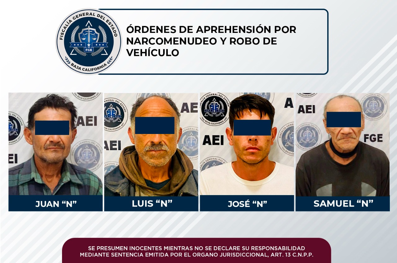 TIJUANA, B.C. - La Fiscalía Regional de Tijuana informa que, a través de la Agencia Estatal de Investigación (AEI), fueron cumplimentadas órdenes de aprehensión, en diferentes puntos de la ciudad, en contra de cuatro hombres que se encontraban prófugos de la justicia.