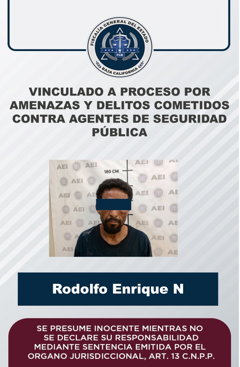 MEXICALI, B.C. - La Fiscalía Regional de Mexicali, a través de la Unidad de Investigación de Delitos con Detenidos Poniente, obtuvo la vinculación a proceso en contra de Rodolfo Enrique “N”, por amenazas y delitos cometidos contra agentes de seguridad pública.