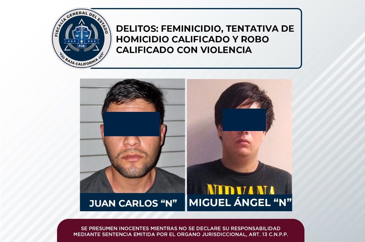 TIJUANA, B.C. - En una rápida acción coordinada por la Fiscalía General del Estado y la Secretaría de Seguridad Ciudadana de Tijuana, se logró la aprehensión de dos sujetos, plenamente identificados como presuntos responsables en los delitos de feminicidio, homicidio calificado en grado de tentativa y robo calificado con violencia.